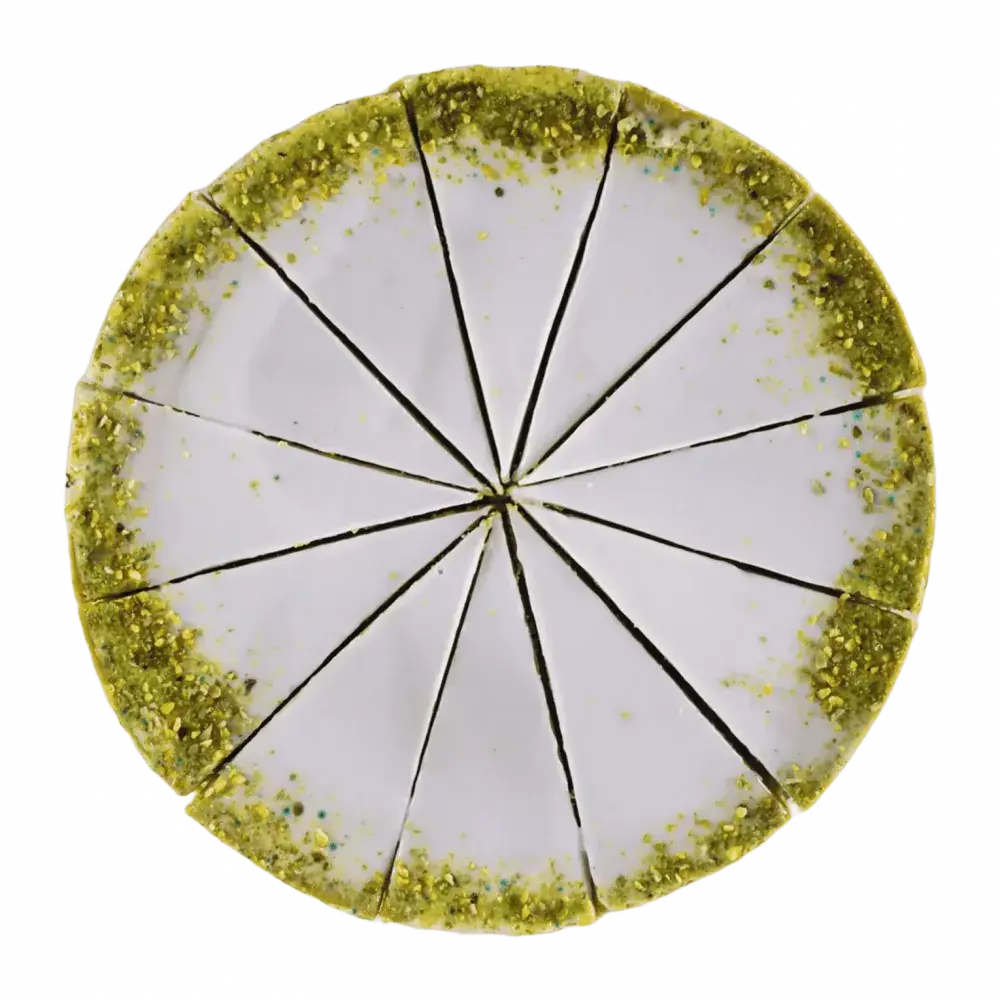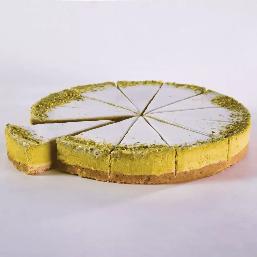Классический сливочный чизкейк на основе коржа из песочного печенья и нежной творожной массы с ярко-выраженным вкусом фисташки, покрытой глянцевым топпингом из сочной белой глазури, декорирован насыщенной дробленой крошкой фисташки, зеленый цвет которой, контрастирует на глянцевой текстуре чизкейка.