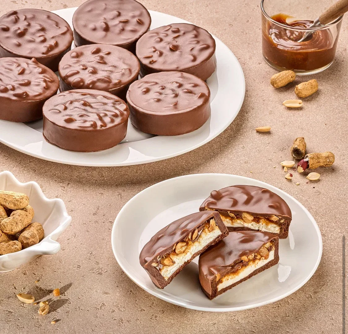 Классическое сочетание рассыпчатой песочной тарталетки, сливочно-сырного крема, соленой карамели, жареного арахиса и шоколадной глазури.