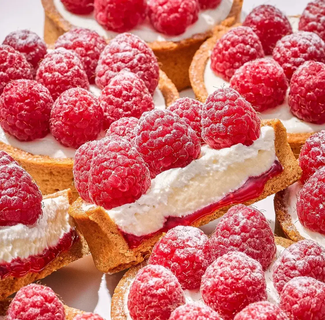 Песочная основа с начинкой из свежей малины и фисташкового крема.