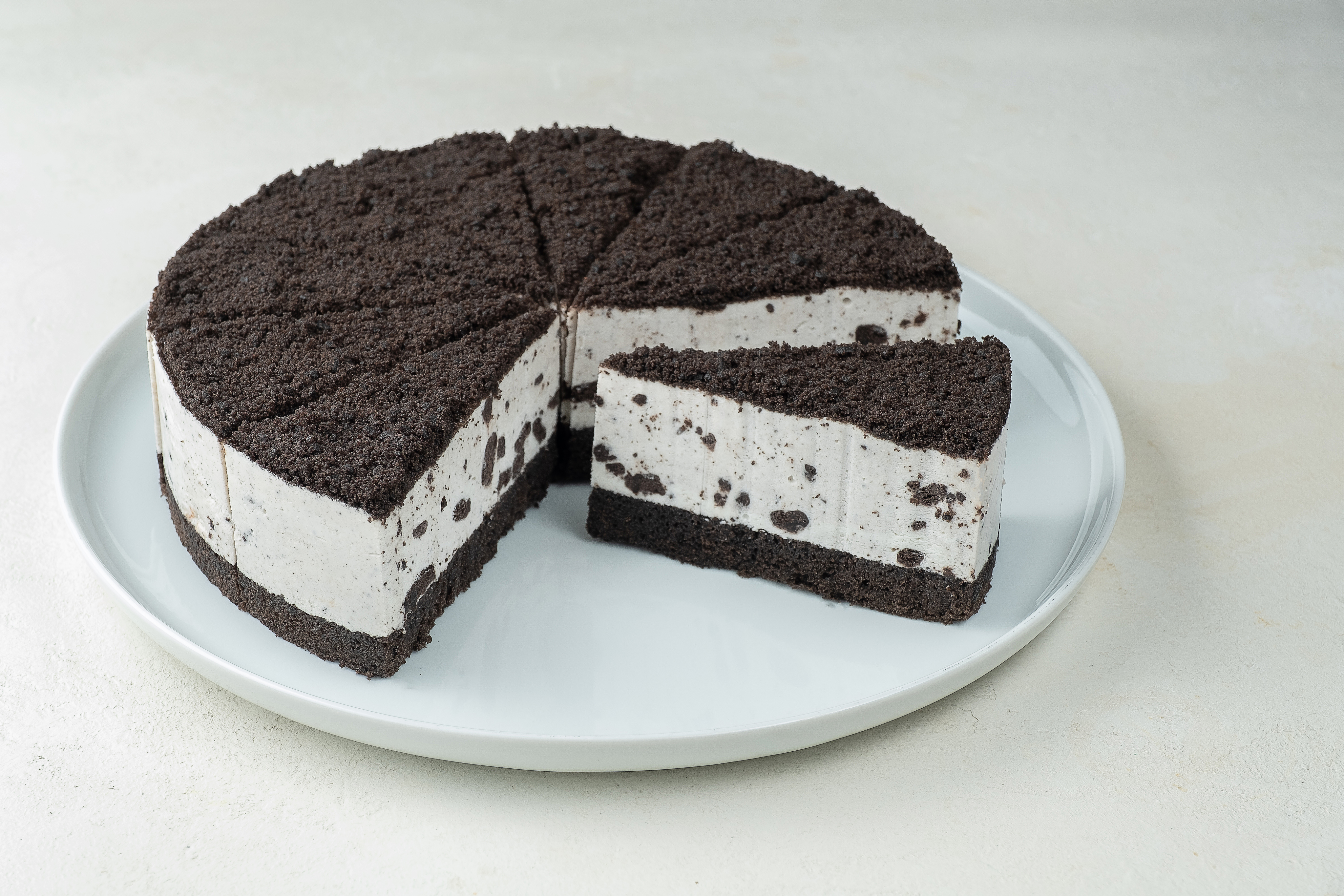 Торт на основе бисквита «Чёрный бархат», суфле со вкусом пломбира, и кусочками печенья.