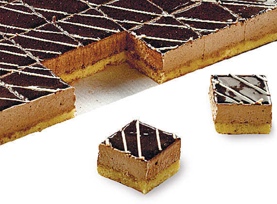 Темно-шоколадный мусс, основой которому служит ванильный бисквит. Декор - оригинальное покрытие «шоколадное зеркало».