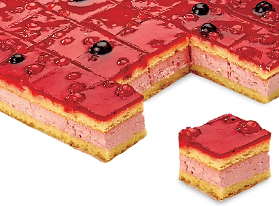 Два слоя хорошо пропитанного фруктовым сиропом бисквита, малиновый крем и ароматные цельные ягоды, покрытые фруктовым гелем..